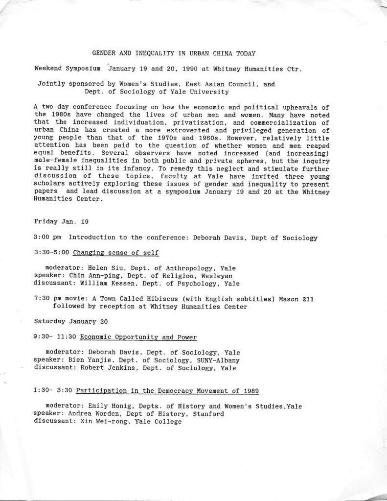 NB: During my first year of graduate school at Stanford, and about seven months after the 1989 Tiananmen Massacre, I was invited to participate in this symposium at Yale on gender inequality in China by one of my professors and mentors at Yale, Professor Deborah Davis. I spoke on women’s participation in the 1989 pro-democracy movement in China.