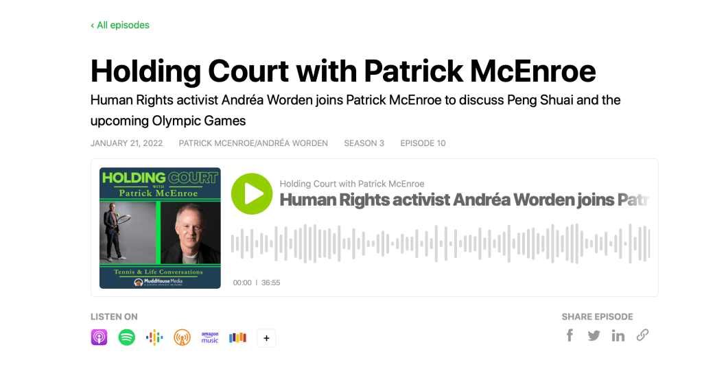 Holding Court with Patrick McEnroe (Jan. 21, 2022) January 21, 2022December 19, 2022 / ajw Human rights activist Andréa Worden joins Patrick McEnroe to discuss Peng Shuai and the upcoming Olympic Games (1/21/2022) https://www.buzzsprout.com/989119/9929091 Share this: Share on X (Opens in new window) X Share on Facebook (Opens in new window) Facebook Like Loading... Related